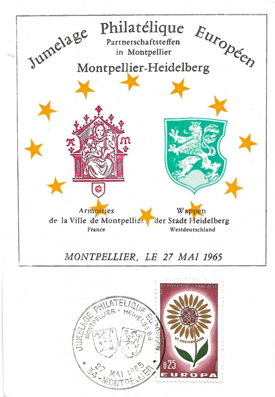 C’est aussi à cette époque qu’un jumelage philatélique est lancé entre l’Association Philatélique Montpelliéraine et la Briefmarken Sammlerverein Heidelberg und Rohrbach en 1965. Il semble que peu d’activités aient été développées par la suite dans ce cadre si ce n’est la participation en compétition à l’exposition régionale à Heidelberg en 2016.