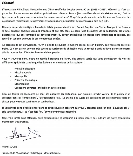 Cette année l'A.P.M. est hébergée par la municipalité de Castelnau-le-Lez, aucune salle n'étant disponible sur Montpellier. Le palais des sports de Castelnau-le-Lez est facilement accessible avec un grand parking gratuit et un arrêt de tram (ligne 2, station lycée Pompidou à moins de 400 m). L'inauguration, suivie d'un apéritif et d'une présentation de tango argentin aura lieu samedi à 11h30. Une exposition importante est présentée (9 collections en compétition, et 5 en cour d'honneur) et présence de commerçants en philatélie. Comme chaque année il y aura un bureau temporaire de la Poste avec émission d'un timbre et d'un bloc spécifiques avec cachet temporaire.